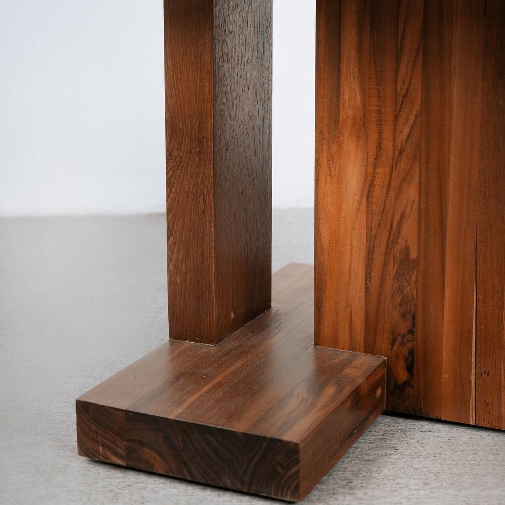 This unique side chair is as much a work of art as it is furniture. Crafted from solid teak wood it combines basic rectangle plank shapes to create a platform for seating.