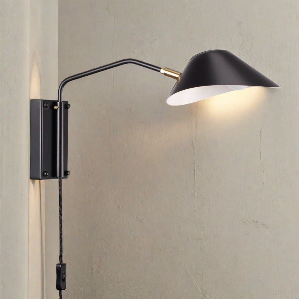 The Chapeau Rotating Wall Sconce is a sleek and stylish wall lamp that will add a touch of modern cool to any room. The arm extends out from the wall to support the Chapeau shaped shade that is angular yet rounded. The shade shape is inspired by French mid-century modern designer Serge Mouille, but with a contemporary tweak. This sconce features a rotating arm, and the shade can swivel and tilt to provide ample focused illumination that making it ideal to place bedside. The brilliant matte black finish is accented with rich brass and a white shade interior.