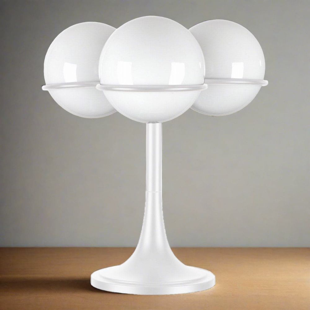 This unique mid-century style table lamp will brighten any table or desk in style. Supported by a metal base this piece features three white glass globes that perfectly diffuse light for ambient illumination. Available in black or gold.