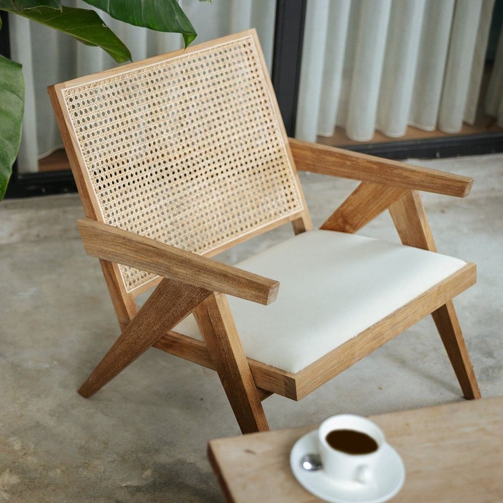 Your favorite chair is now available with a built-in seat pad for added comfort and durability! Our Jeanneret Lounge Chair is inspired by Swiss architect Pierre Jeanneret's mid-century modern Chandigarh Chair. Like the original, our contemporary reproduction has V-shaped solid wood legs, and a woven caneaccents that provides an astonishing level ofsophistication.