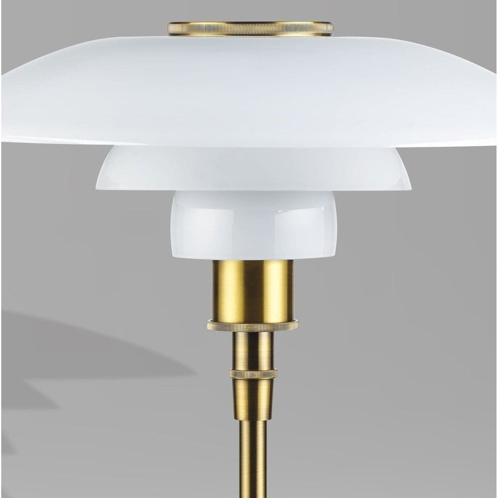 TheHenningsen LargeTableLamp is inspired by mid-century modern designs; the stylish multi-layered glass shades createglare free illumination. The central light source is completely invisibleandhidden within the glass shades.The opal glass lampshades also diffuse the light perfectly to create an ambient glow with a standard 60 watt bulb at the center. Available in gunmetal, brass, or chrome.