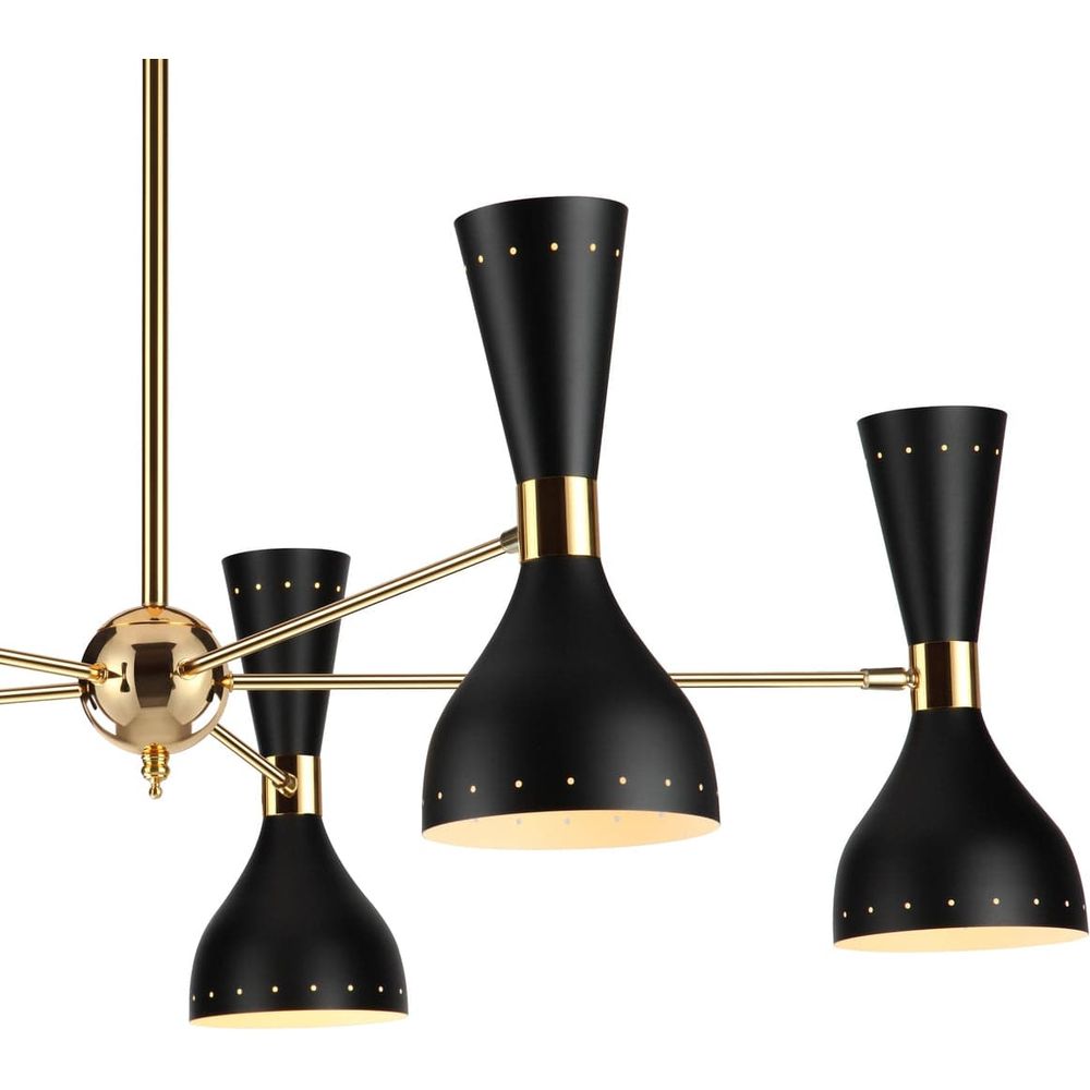 Inspired by mid-century modern design but with an air of timelessness, this chandelier will light up any space in style. Five double-cone shades are distributed around the center meeting point to fill your room with light. Each cone contains a standard 60 watt bulb, meaning light is directed both up and down. Available in black or white, and 3 or 5 arm variations.