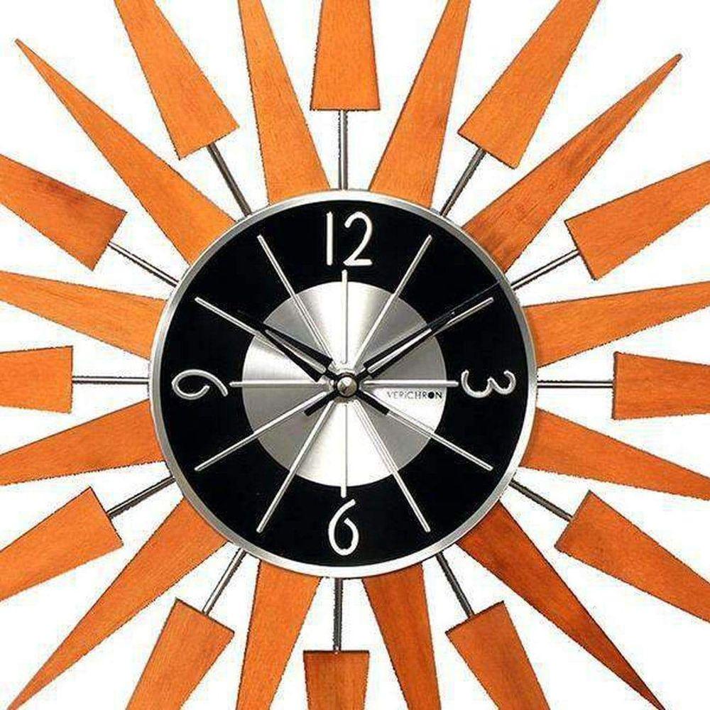 Inspired by the mid-century modern clock designs of George Nelson, this clock will brighten any room. Solid pine triangular wedges burst from the silver and black metal face. This brilliant clock is the perfect accent for any wall.