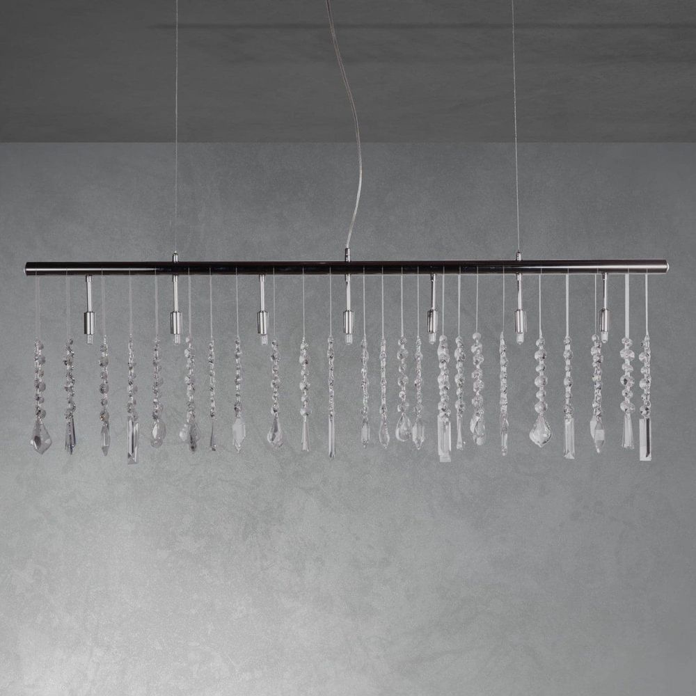 Delicate yet with a touch of industrial style this chandelier will look great in modern and contemporary spaces alike. Featuring a linear suspension design this piece is draped in dozens of hanging lead crystals. Each string hangs independently to catch and refract light from the seven bulbs in all directions. The chromed steel finish adds shine whether the light is turned on or off. This chandelier is ideal for placing over tables or islands.