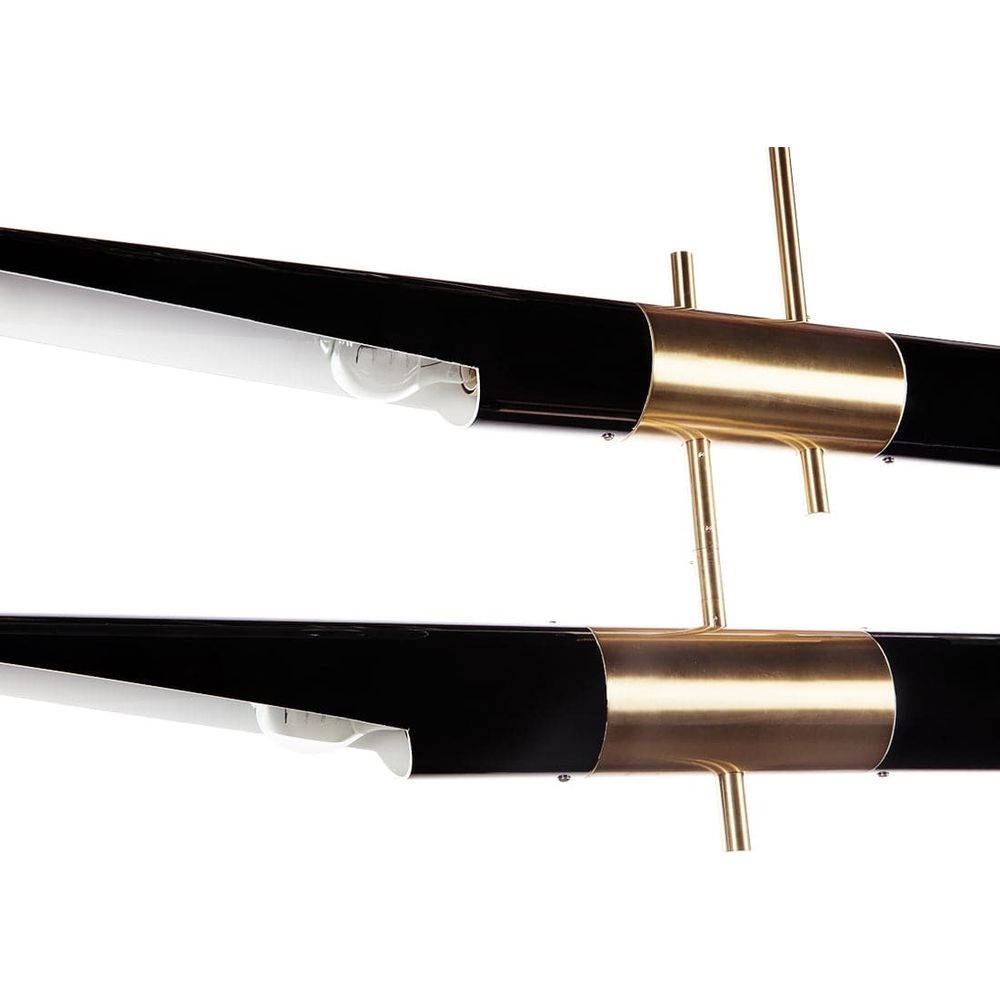 With a sleek design and sophisticated finish this chandelier will look great in modern and contemporary spaces alike. Each tier has two light bulbs nestled within aluminum tubes that focus the light outward towards the room. The elegant black and gold color scheme will illuminate any space in style. Light from the six standard 40 watt bulbs will provide ample ambient lighting.