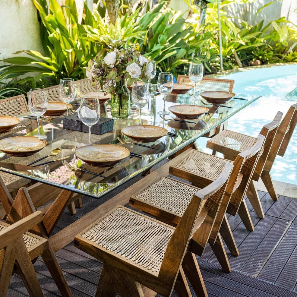 Our Jeanneret Side Chair is now perfect for outdoor use! Inspired bySwiss architect Pierre Jeanneret's mid-century modern 1950sChandigarhdesign: Like the original, our contemporary reproductionhasV-shaped solid wood legs, and acane seat that provides plenty of comfort.
