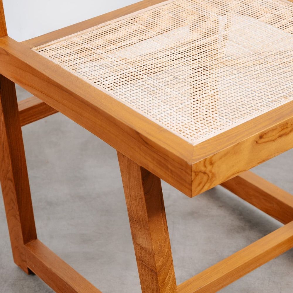 A charming compliment to the Jeanneret side and arm chairs this piece brings its own style to the table. The rattan seat is supported by a teak wood frame that features sleigh legs and a more open back.