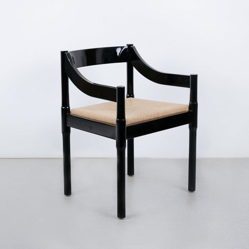 This stunning dining armchair is inspired by the design of Vico Magistretti. The gently sloped arms and textured seat combine to add a touch of casual sophistication to any room. Crafted from mahogany and given a chic glossy finish.